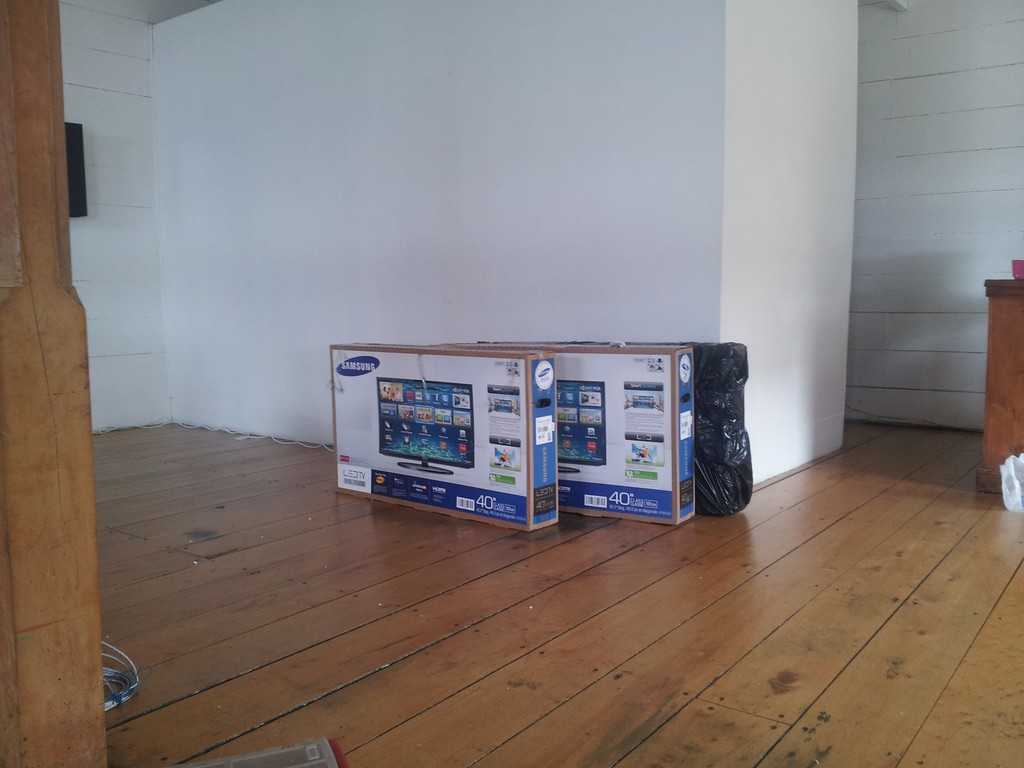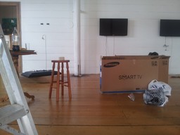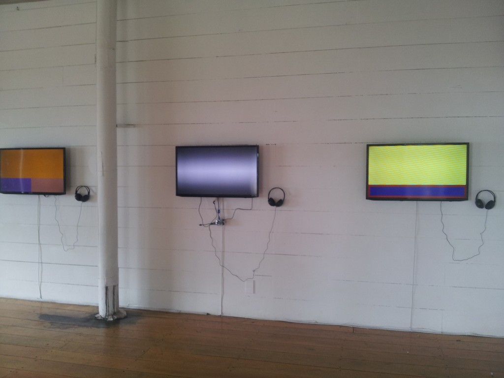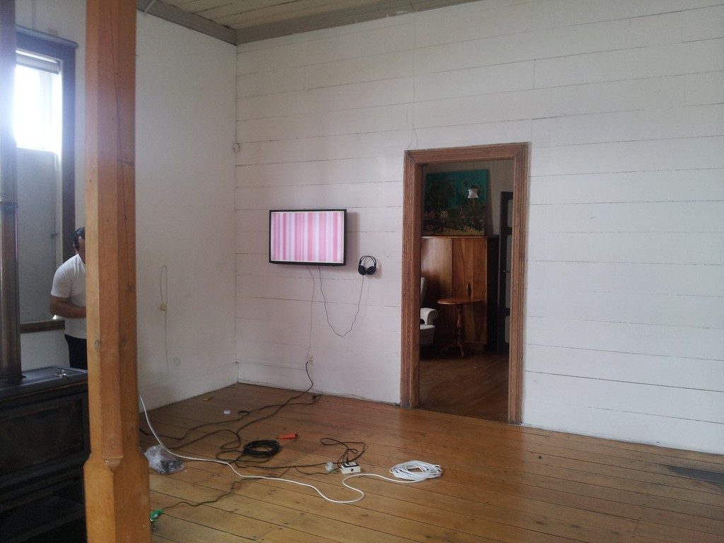 Montaje de la Exposición 10 sistemasAutopoiéticos Autónomos. Aqui se aprecia la conexión de los Raspberry Pi a los monitores, la tarjeta de sonido y el microfono.