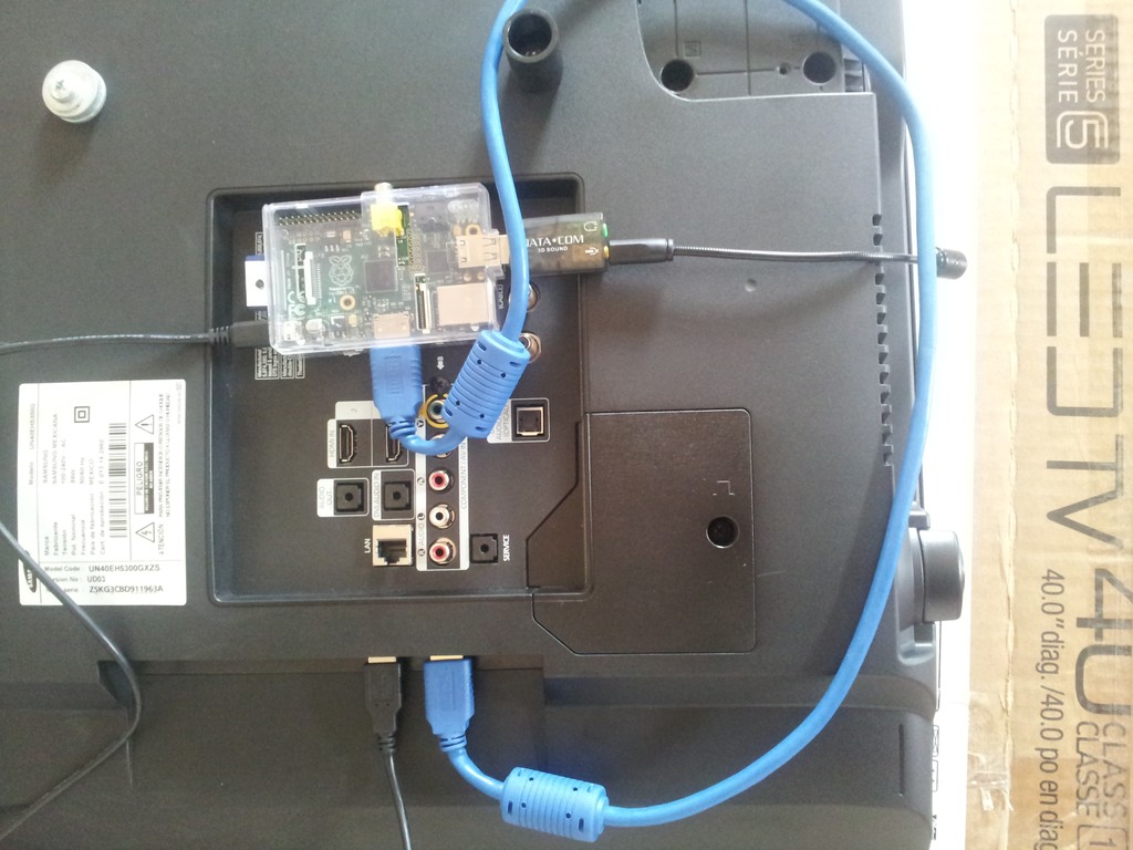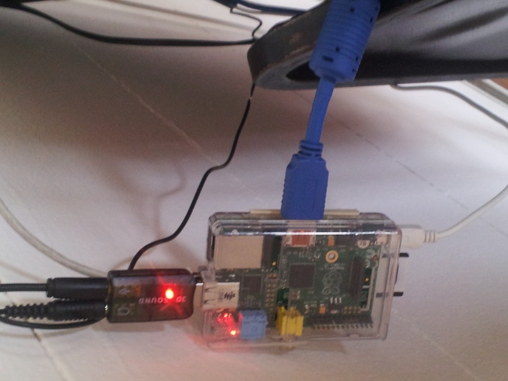 Mounting of the 10 Autonomous autopoieticSystems Exhibition. Here you can see the conections of the Raspberry Pi to te screens, the soundcard and the microphone.